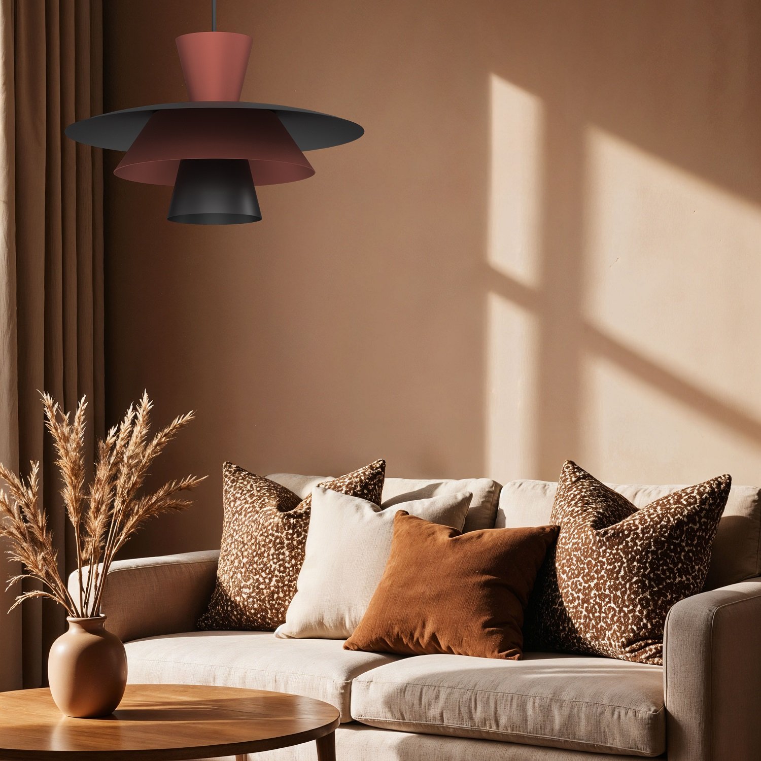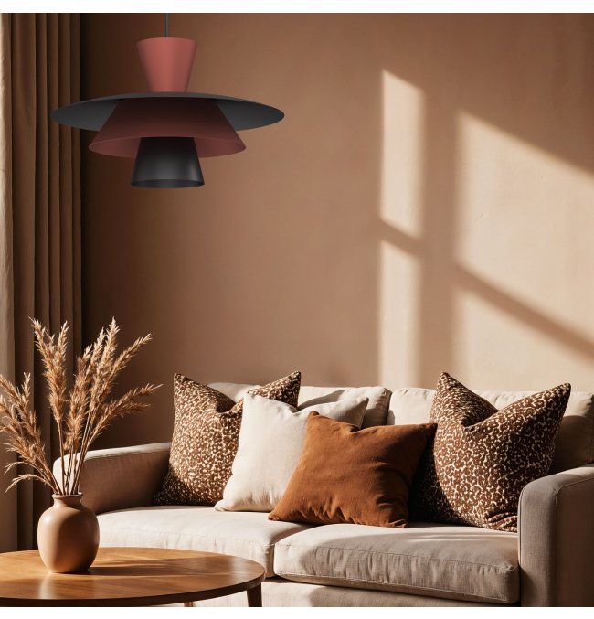 Przyciągająca uwagę czarno-miedziana lampa wisząca z serii PLATO to idealny wybór dla miłośników nowoczesnego designu. Wykonana z metalu w matowej czerni z subtelnymi, miedzianymi akcentami, emanuje elegancją i nowoczesnością. Prosta forma i wyrafinowane detale sprawiają, że doskonale wpasuje się w każde wnętrze.